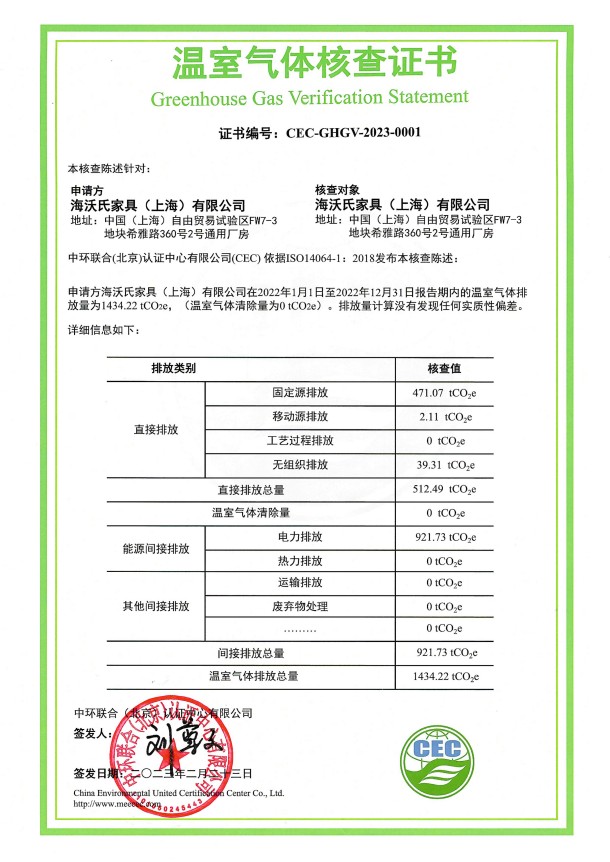海沃氏家具(上海)有限公司-CEC-GHGV-2023-0001-溫室氣體核查證書
